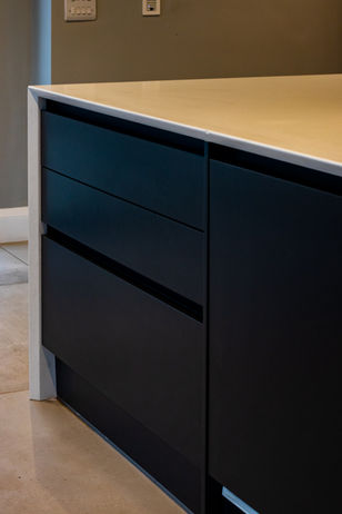 The introduction of Halifax Oak in this modern kitchen softens the dark, handleless cabinetry and Caesarstone Frosty Carrina quartz worktop, and seamlessly blends the interior and outdoor living spaces of this home. The induction hob with flush ceiling extractor provide an uninterrupted view to the outside whilst the mirror splashback reflects and frames the beautiful scene, creating a stunning focal point when at the sink area.