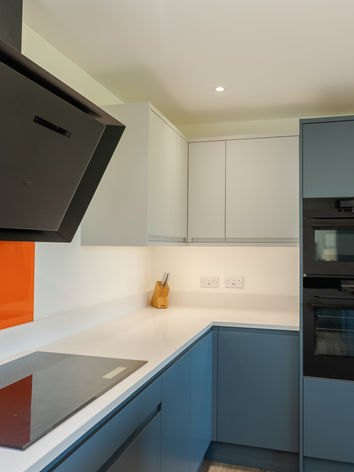 The matt storm blue cabinetry paired with pops of zesty orange and bright neutrals is a striking palette in this contemporary kitchen, A minimal look is achieved through the handleless design and undermount sinks which result in uninterrupted lengths of Silestone White Storm quartz worktops. The sleek matt black appliances and statement extractor only add to the modern feel of this space.