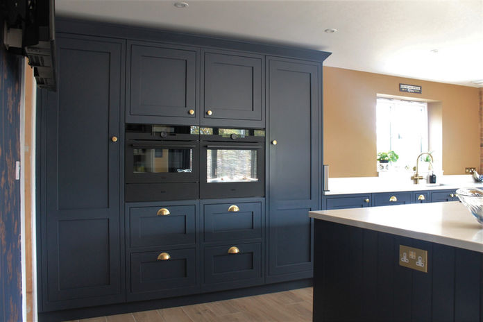 The homeowners chose the Woodbridge shaker style cabinetry with tongue and groove details hand painted in a deep blue shade which contrasts the rich earthy decor. A complimentary dove grey has been used for the dresser unit with bifold doors and grey oak interior. Brass door furniture, fixtures and fittings add further warmth, whilst the light quartz worktops elevate the scheme.
