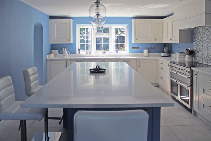 They opted for our Woodbridge cabinetry with traditional touches including tongue and groove panels and chamfered posts to create a classic look. The cabinetry is hand painted in Mylands Cadogan Stone whilst the island is in the striking shade, Mylands Boathouse, which matches the walls. The colour palette is completed with the luxurious CRL Calacatta Dorado worktops with its dramatic veining and a heritage pattern tile splashback which marries the scheme. Stainless steel door furniture, brassware and appliances including Rangemaster cooker, are elegant additions to the space.