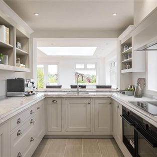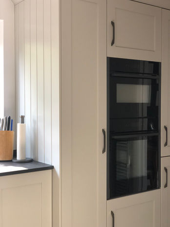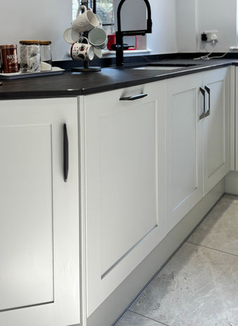 This beautiful kitchen and complimentary utility room are spaces of contrast and harmony. The design pairs the timeless appeal of classic shaker style cabinetry with sharp, modern lines and sleek integrated appliances. Finished in a soft, warm grey, the cabinetry creates an inviting, serene atmosphere, while dark worktops and bold black hardware add dramatic depth and a contemporary edge. Thoughtfully designed, this space strikes a perfect balance between traditional aesthetics and modern functionality; ideal for everyday living.