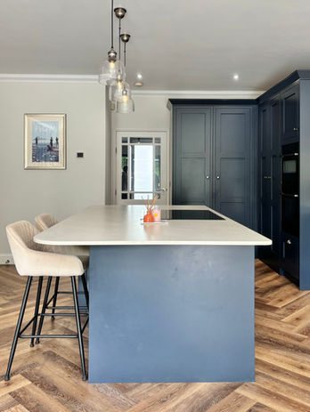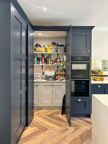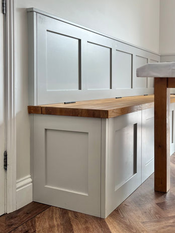 For this warm and welcoming family home, we crafted a contemporary shaker-style kitchen that blends elegance with everyday practicality. At the heart of the design is a hidden walk-in pantry, keeping essentials neatly tucked away while maintaining a clean, streamlined look. Durable ceramic worktops stand up beautifully to the demands of busy family life, while a dedicated breakfast station brings ease to morning routines. Completing the space is a bespoke dining bench with hidden storage, which alongside the adjoining coordinating boot room, is perfect for keeping the home organised and effortlessly stylish.​​